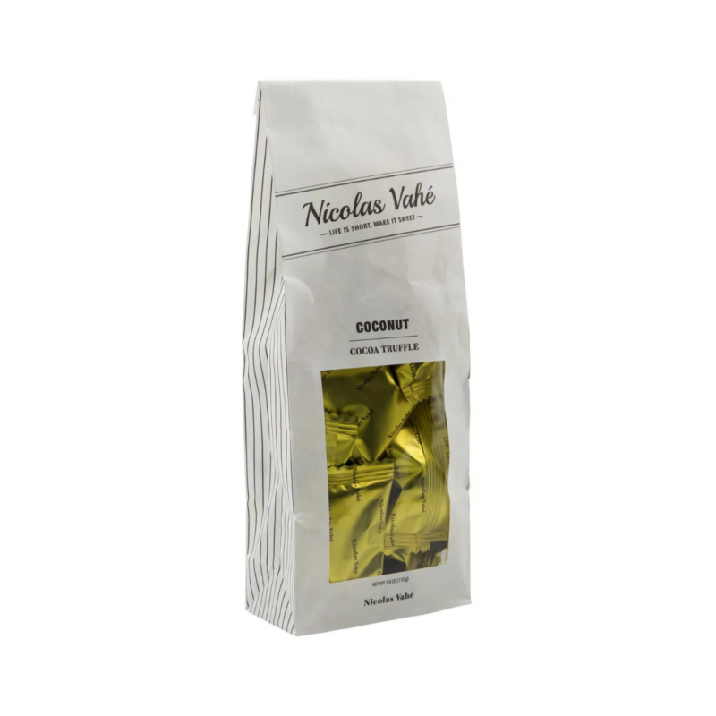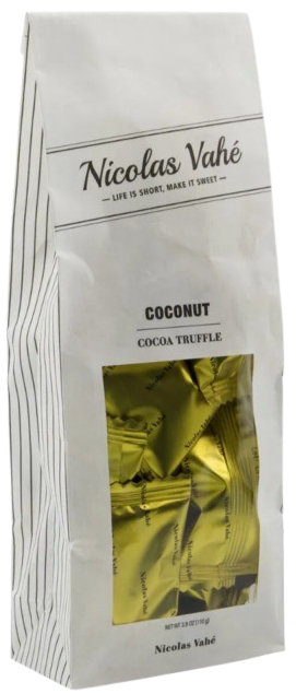 Súkkulaðitrufflur með kókosbragði. Sælkera nammi frá Nicolas Vahé sem kemur manni skemmtilega á óvart með smá krunsi í bland við ljúffengt súkkulaði. Einfaldlega of gott til að tíma að deila með sér. Við mælum hinsvegar með því að deila með vinum og fjölskuldu því þú munt slá í gegn með þessu æðislega súkkulaði.
