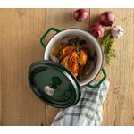 Upplifðu ekta franska stemmningu í eldhúsið með þessum potti úr steyptu járni. Notaðu hann til að laða fram girnilega pottrétti í ofni eða á hellu. Prófaðu líka að baka brauð eða hægelda kjötstykki.Potturinn þolir allt að 240°C hita og má fara í ofn. Hvít högg- og slitsterk glerjungshúðun að innan og fallega tvílitur að utanverðu. Að innanverðu er lokið með litlum oddum sem fá gufu og safa til að drjúpa yfir matinn á meðan eldun stendur.
