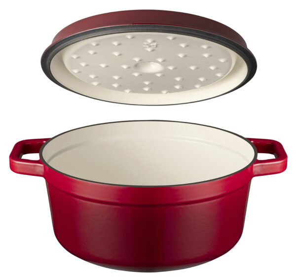 Upplifðu ekta franska stemmningu í eldhúsið með þessum potti úr steyptu járni. Notaðu hann til að laða fram girnilega pottrétti í ofni eða á hellu. Prófaðu líka að baka brauð eða hægelda kjötstykki.Potturinn þolir allt að 240°C hita og má fara í ofn. Hvít högg- og slitsterk glerjungshúðun að innan og fallega tvílitur að utanverðu. Að innanverðu er lokið með litlum oddum sem fá gufu og safa til að drjúpa yfir matinn á meðan eldun stendur.