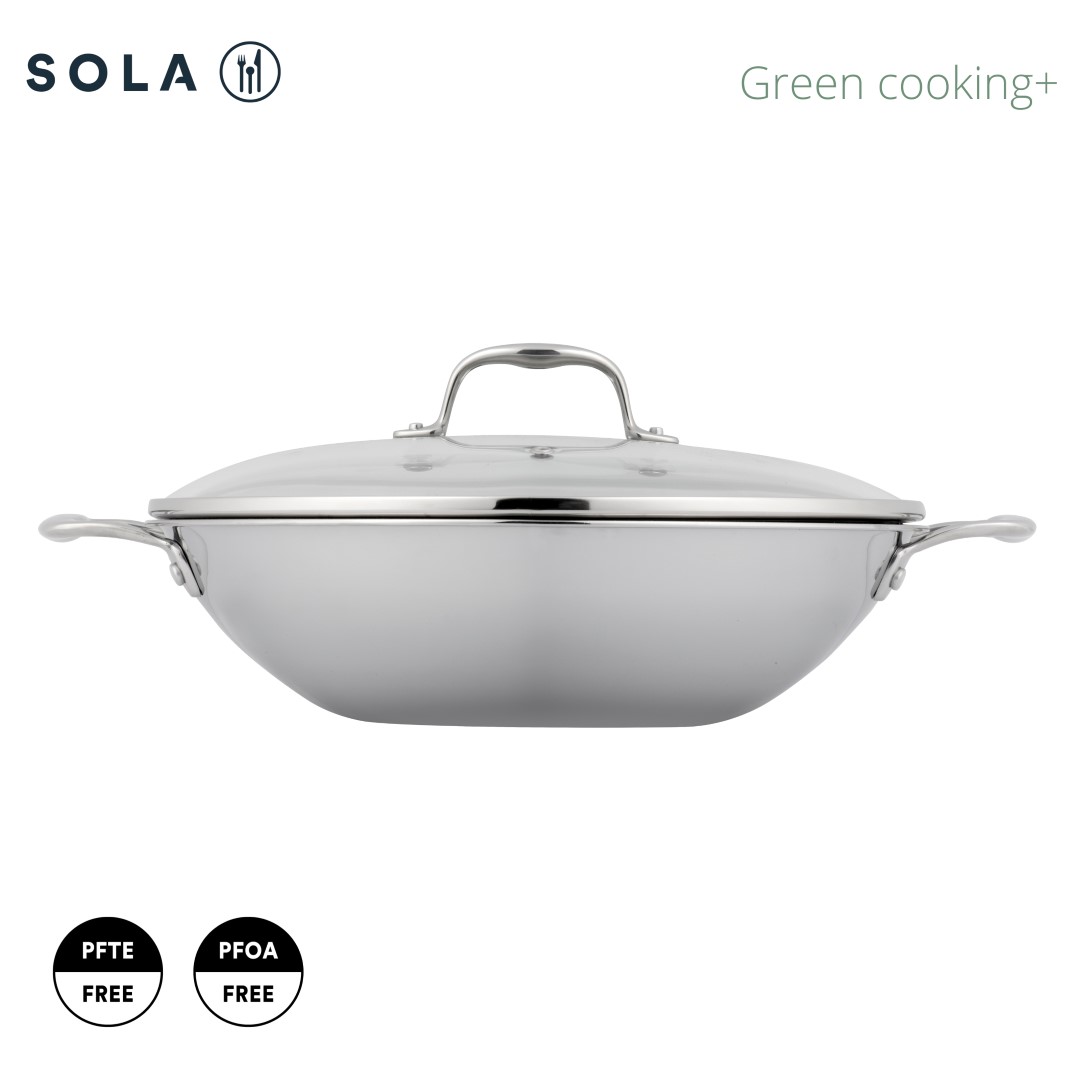 Sola Green Cooking+ er vandaðasta línan frá Sola. Pönnurnar eru úr þriggja laga stáli og með einstaklega góðri hitaleiðni. Pönnurnar eru ekki með neinni húðun svo það eru engin eiturefni sem pannan gæti gefið frá sér. Sola Green Cooking+ pönnurnar þola uppþvottavél.