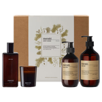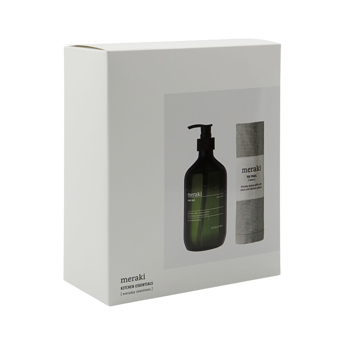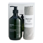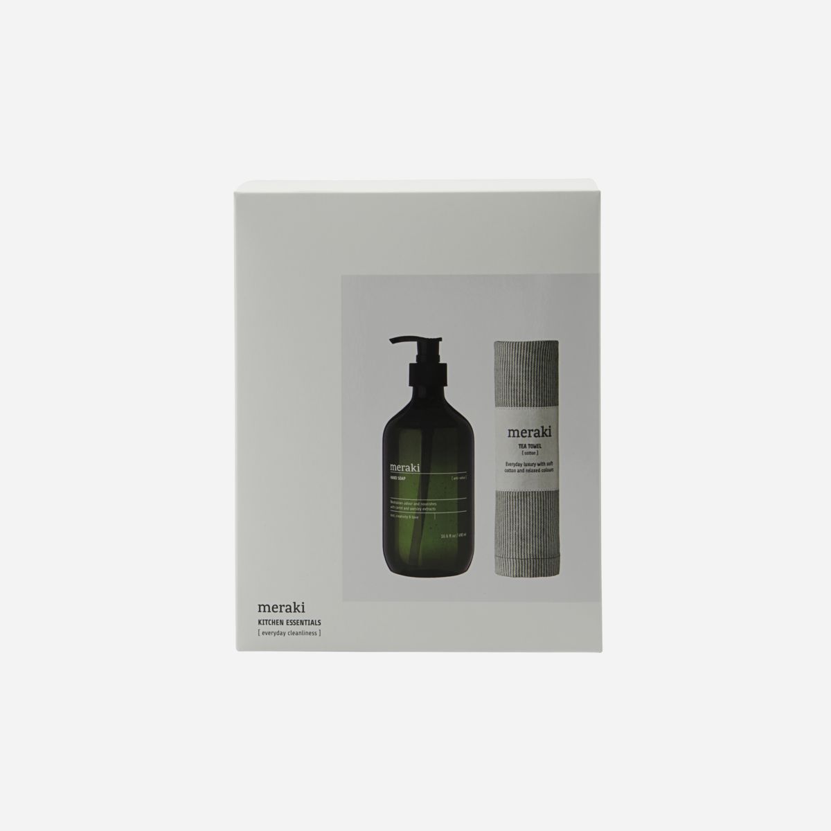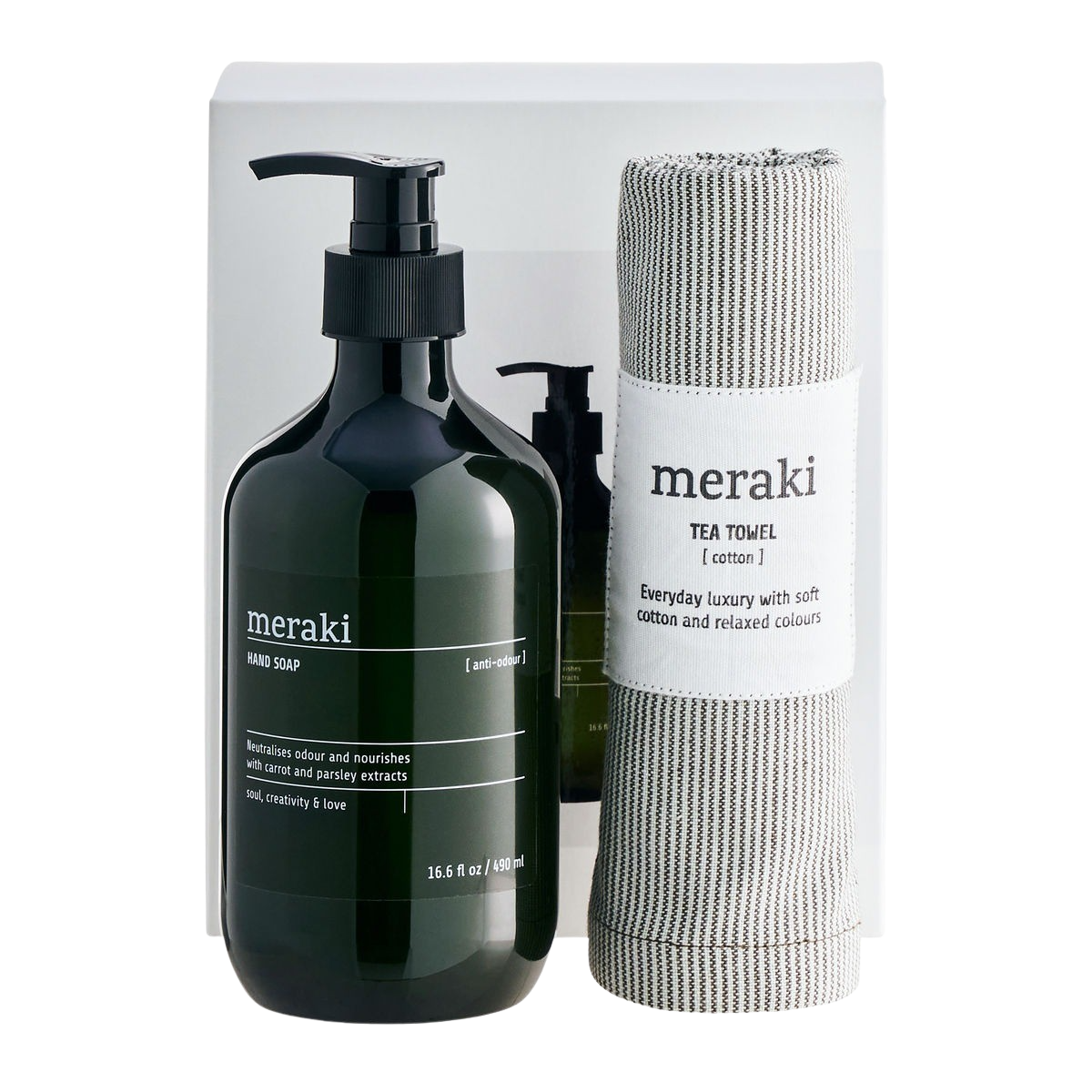 Vandað gjafasett frá Meraki með lyktareyðandi handsápu og fallegu viskastykki.