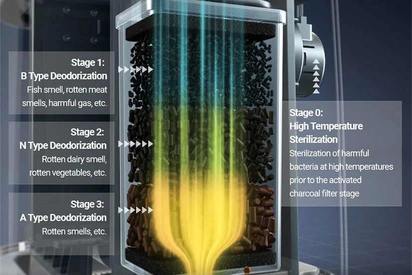 Þriggja skrefa ferli með kolasíu tryggir nær lyktarlausa losun.