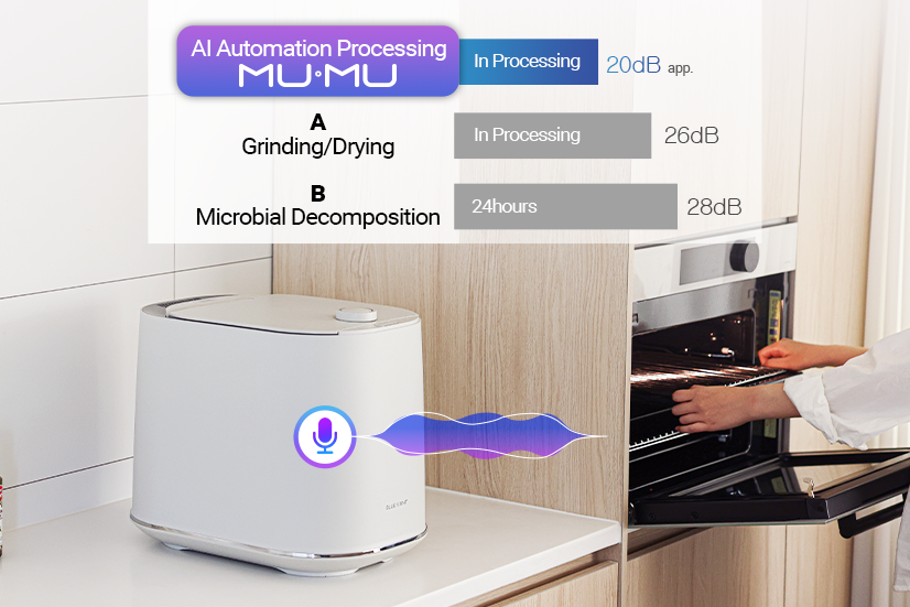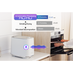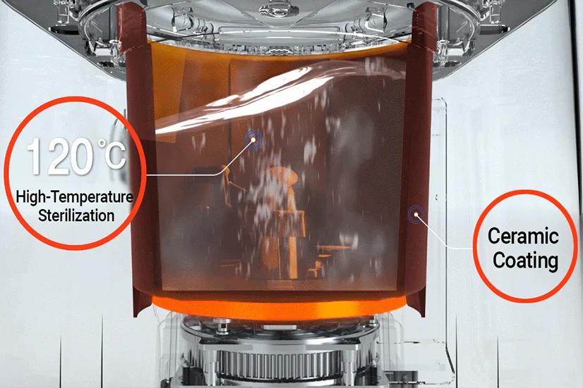 Innbyggt sjálfhreinsikerfi þvær fötuna á 120°C. Eina sem þú þarft að gera er að hella vatni í og kveikja á "Cleaning". Keramík-húðun kemur í veg fyrir að óhreinindi setjist að í fötunni.BlueVent MUMU moltugerðartækið er þín lausn fyrir sjálfbært heimili.