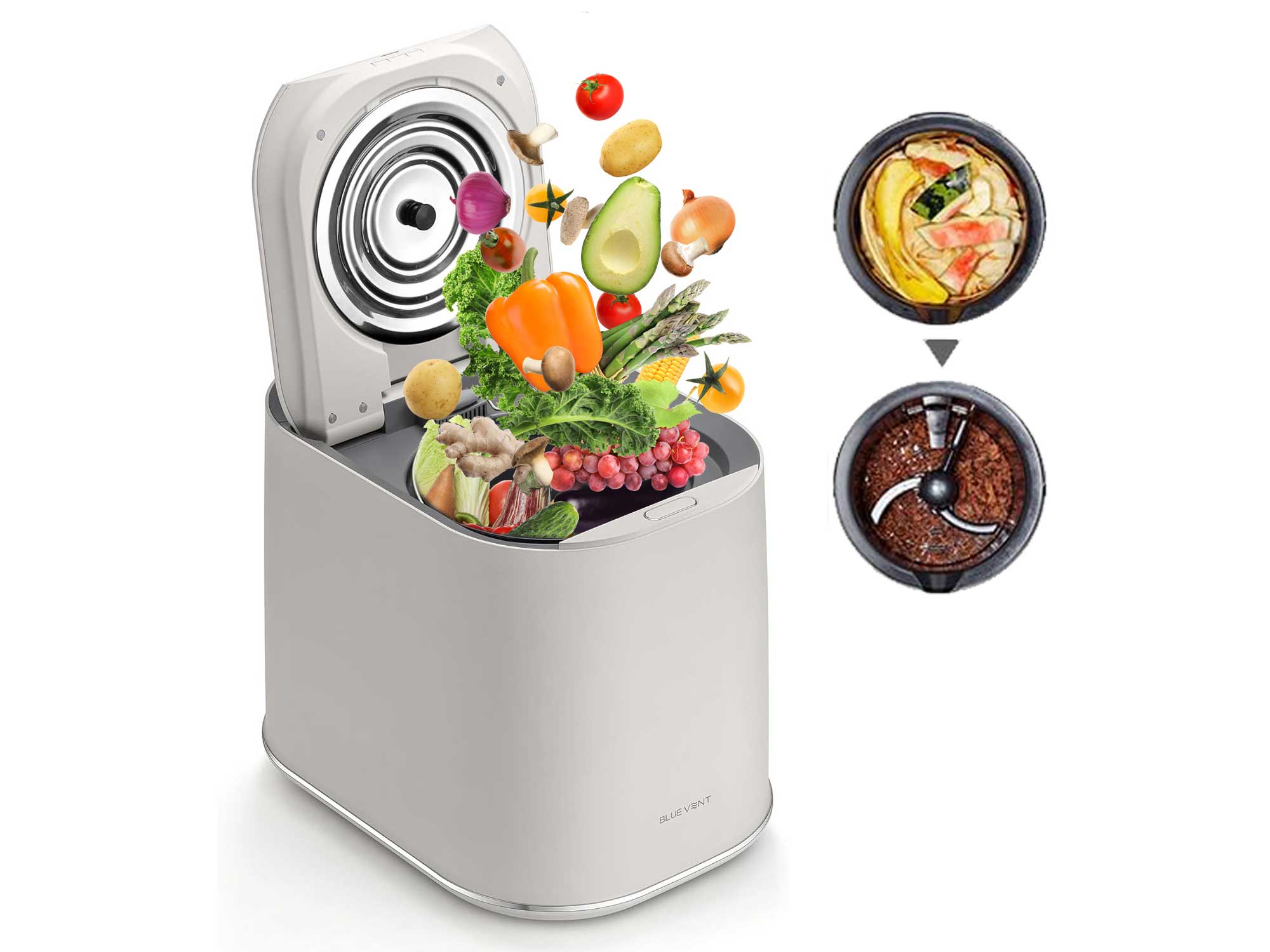 - Brýtur niður matarafganga til að búa til moltu eða áburð - hægt að geyma þar til seinna