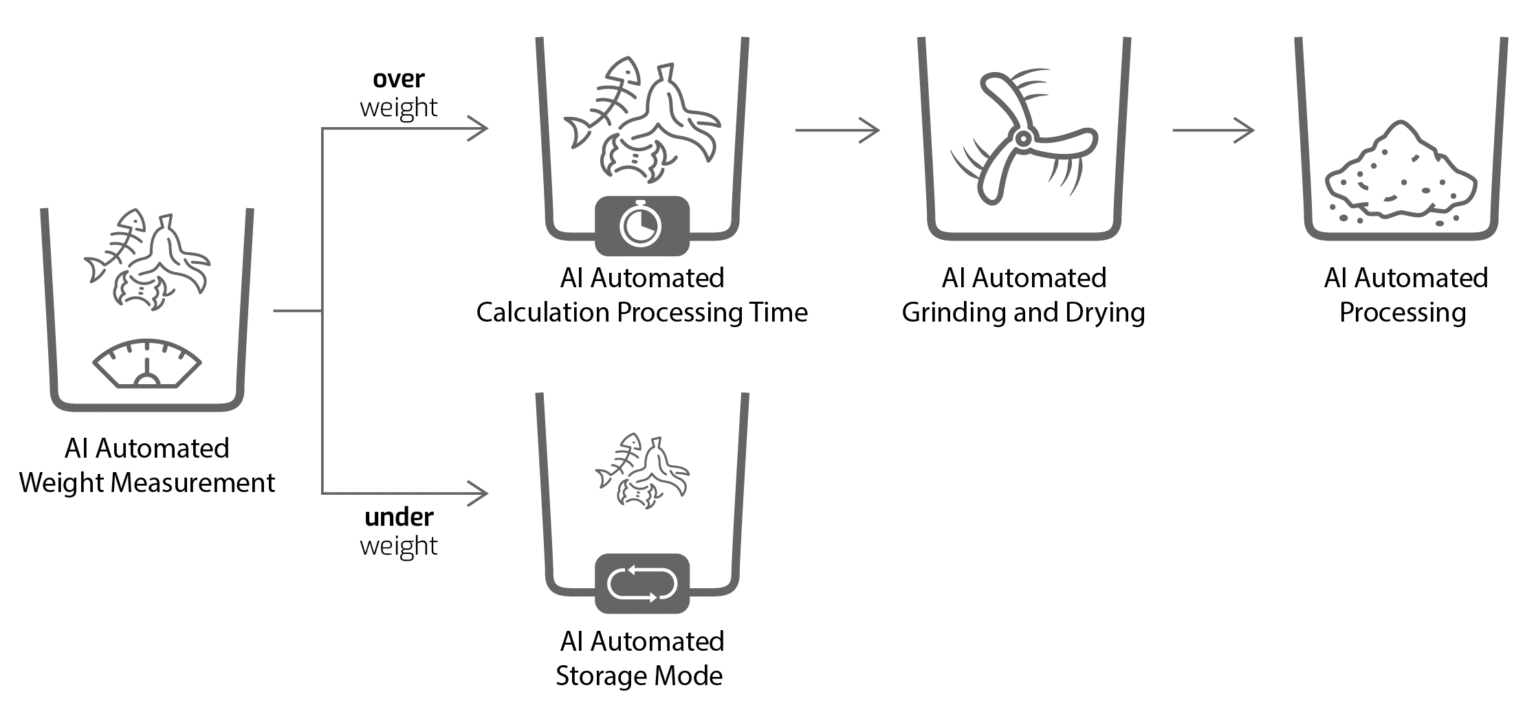 Innbyggð vog í tækinu metur vinnsluþörf eftir þyngd og aðlagar sig hverju sinni.
