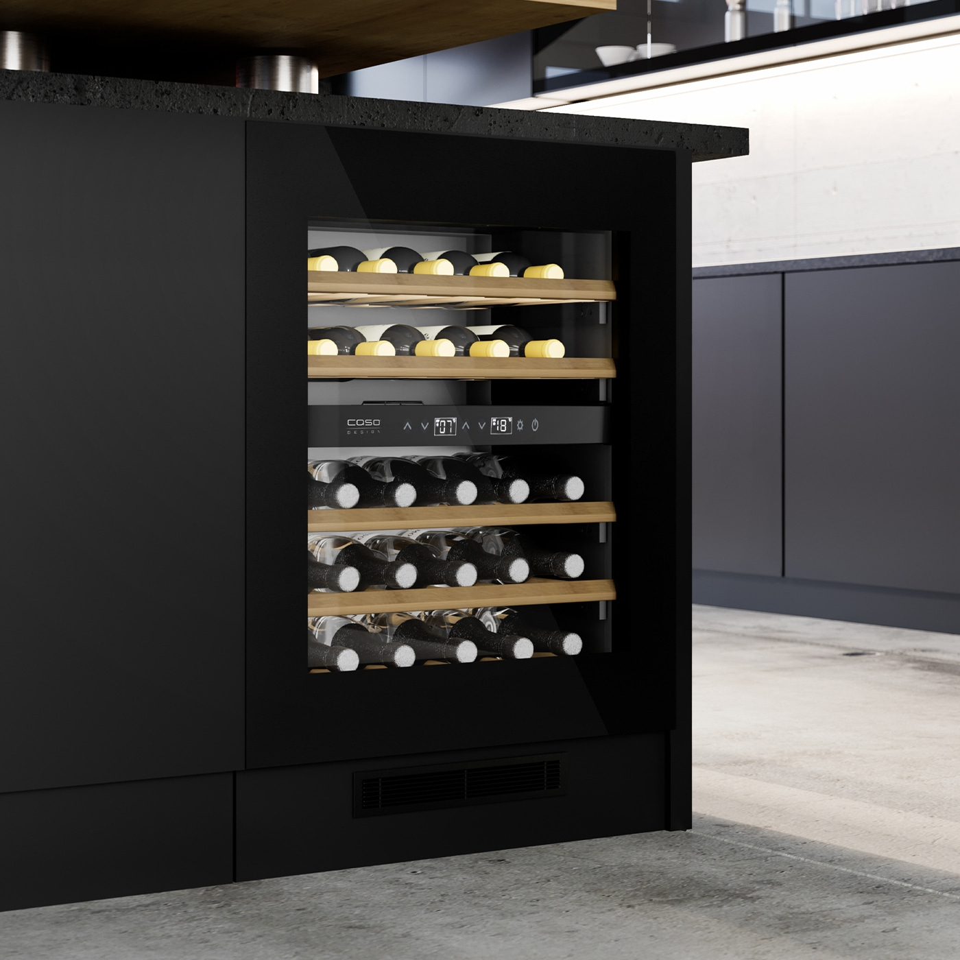 Vandaður vínkælir frá þýska framleiðandanum Caso. Þessi skápur er 100% innbyggjanlegur í innréttingu og verður hann alveg sléttfelldur við eldhúsið þegar honum er komið fyrir.
