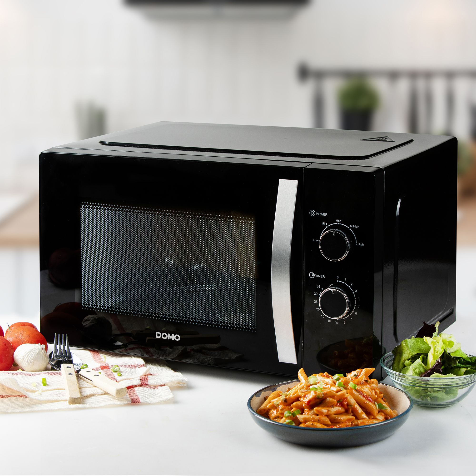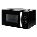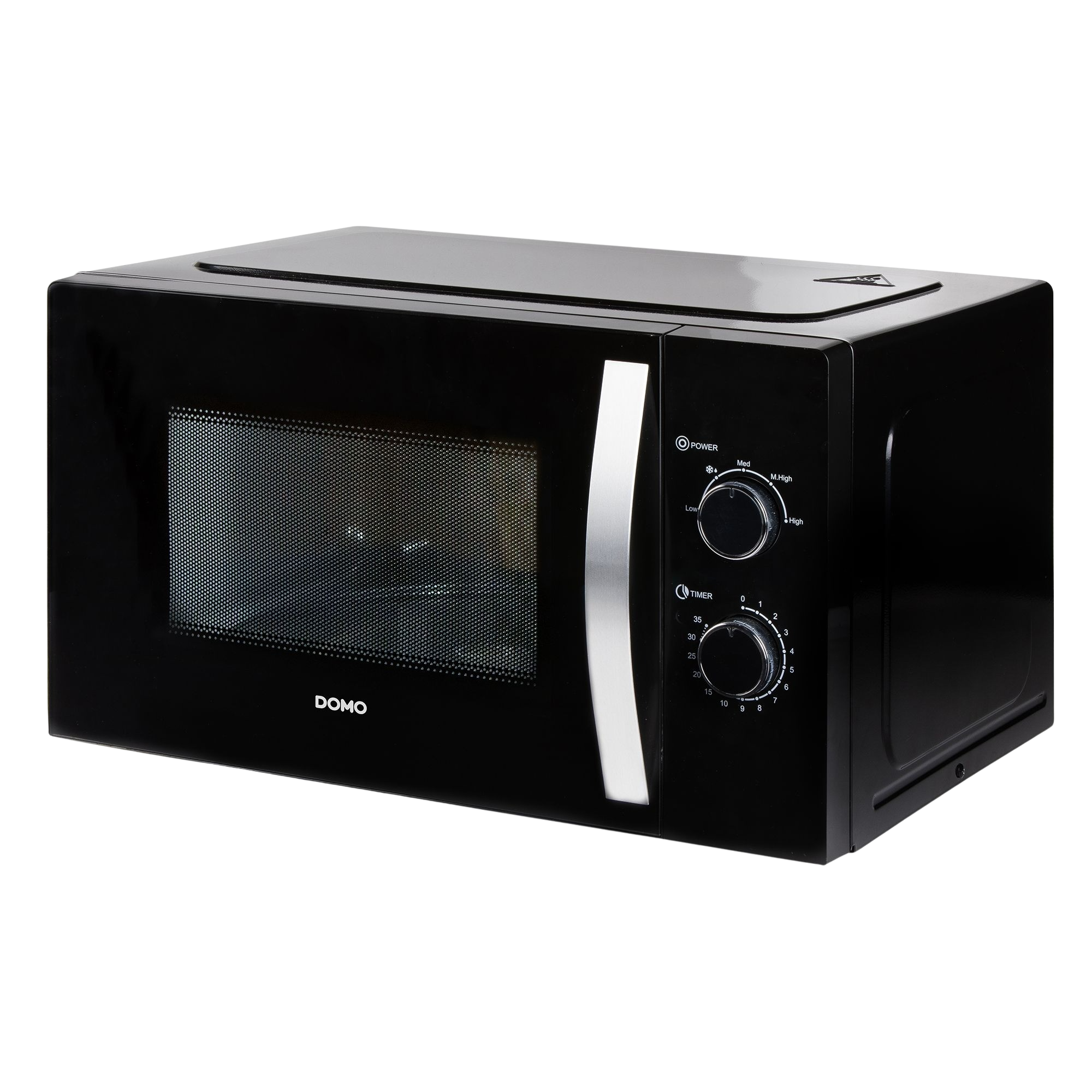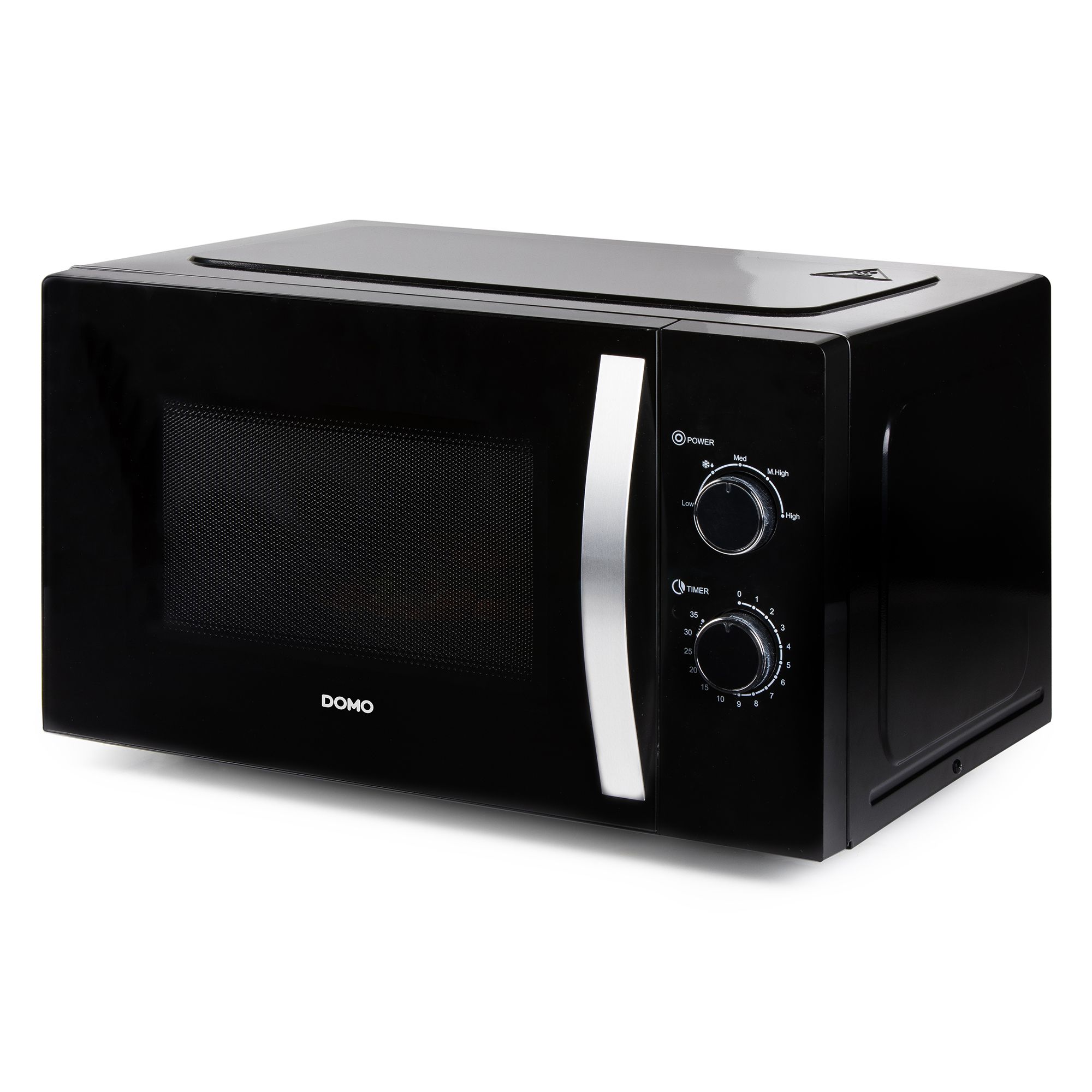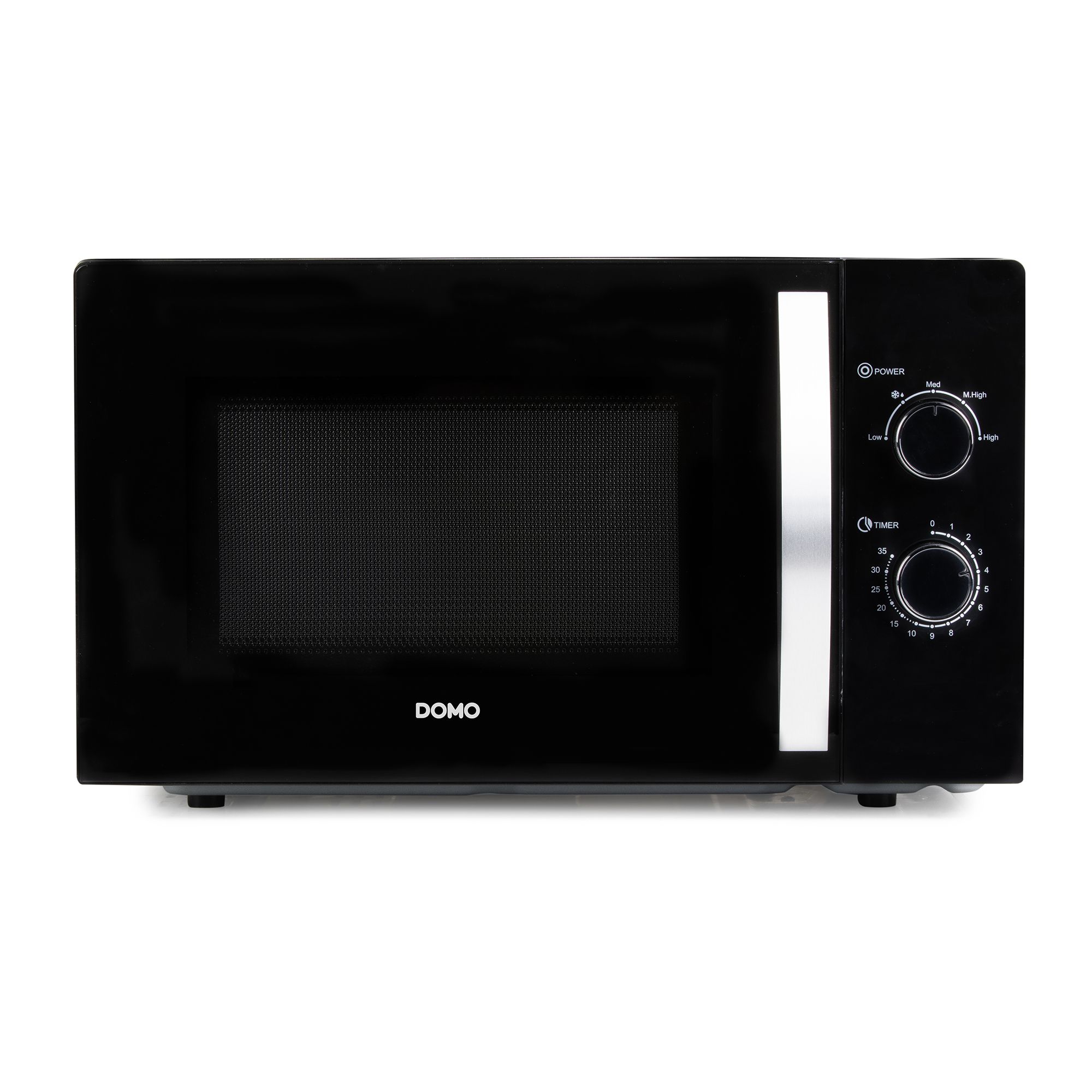 Flottur svartur örbylgjuofn frá Domo með tveimur snúningshnöppum. Ofninn kemur með 5 mismunandi kraftstillingum.