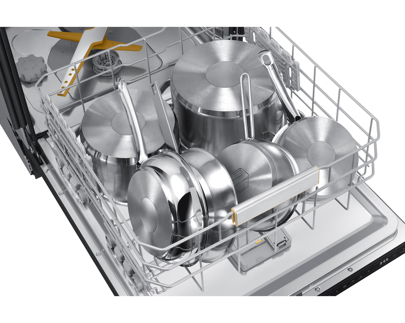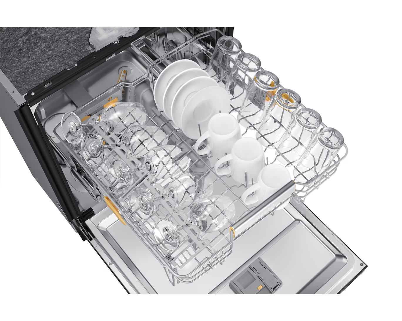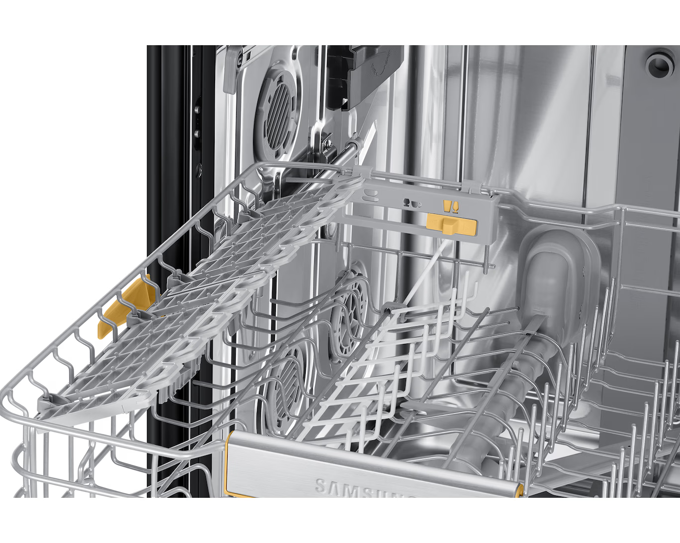 Samsung uppþvottavél í svörtu stáli. Hljóðlát, orkusparandi og opnar sig sjálf þegar þvotti er lokið með AutoOpen tækni.
