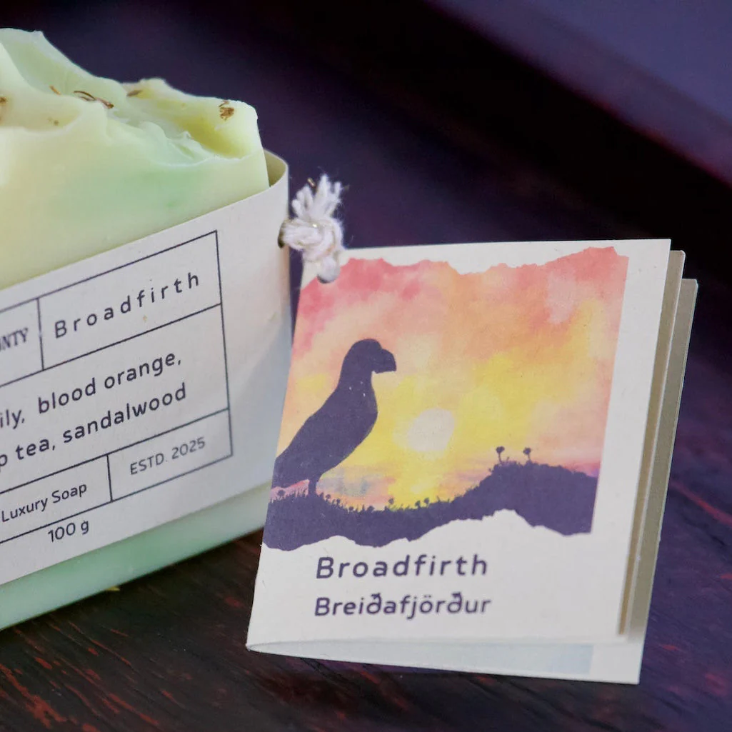 Sápunni fylgir hefti með fróðleiksmolum um Breiðafjörð á ensku og er myndskreyting eftir íslenskan listamann. Fullkomin heimilisgjöf.