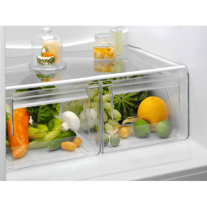 - Björt sparneytin LED lýsing í miðjum skápnum sem varpar ljósi á allar hillur