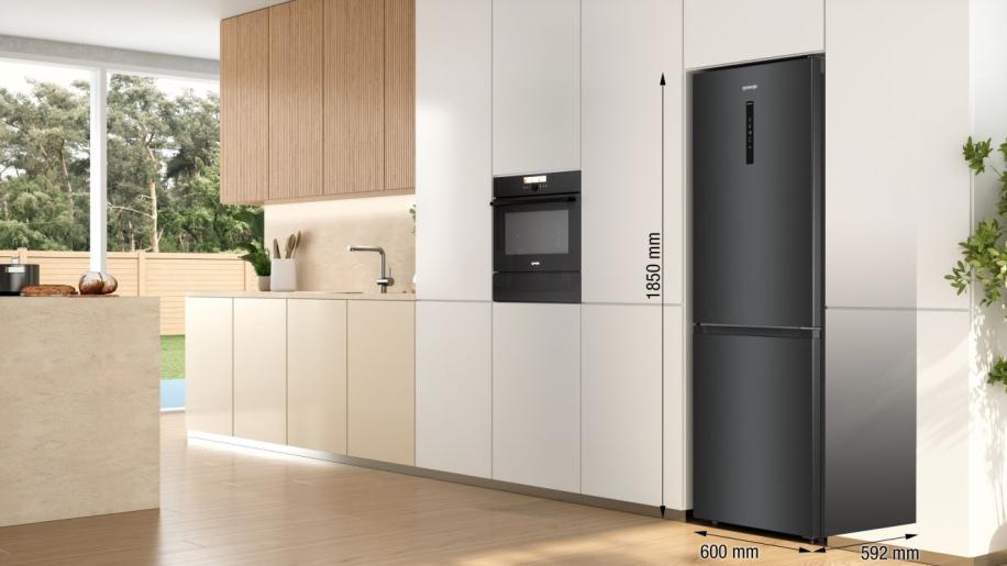 Stílhreinn skápur frá Gorenje með sjálfvirkri afþýðingu (no-frost). Þessi skápur er grynnri en hefðbundinn kæliskápur, aðeins 59,2cm og getur því verið sléttfelldur við hefðbundna eldhúsinnréttingu.